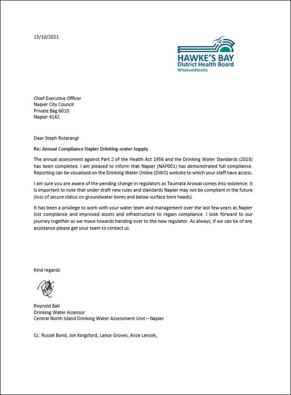 To inform the Council on the status of Napier Water Supply (NAP001) at the end of fourth quarter (Q4) of 2020-2021 compliance year.