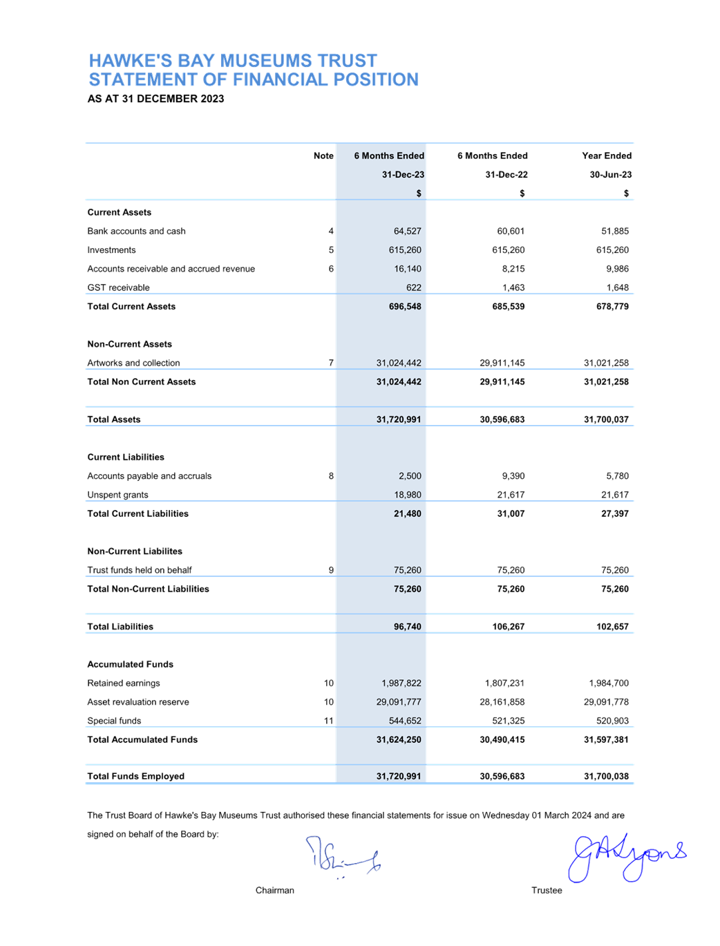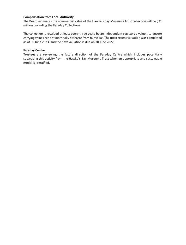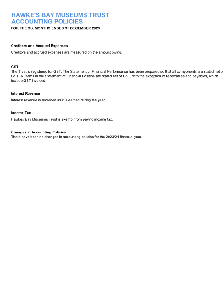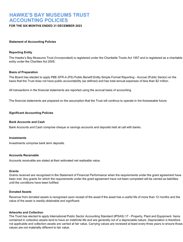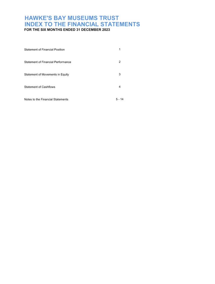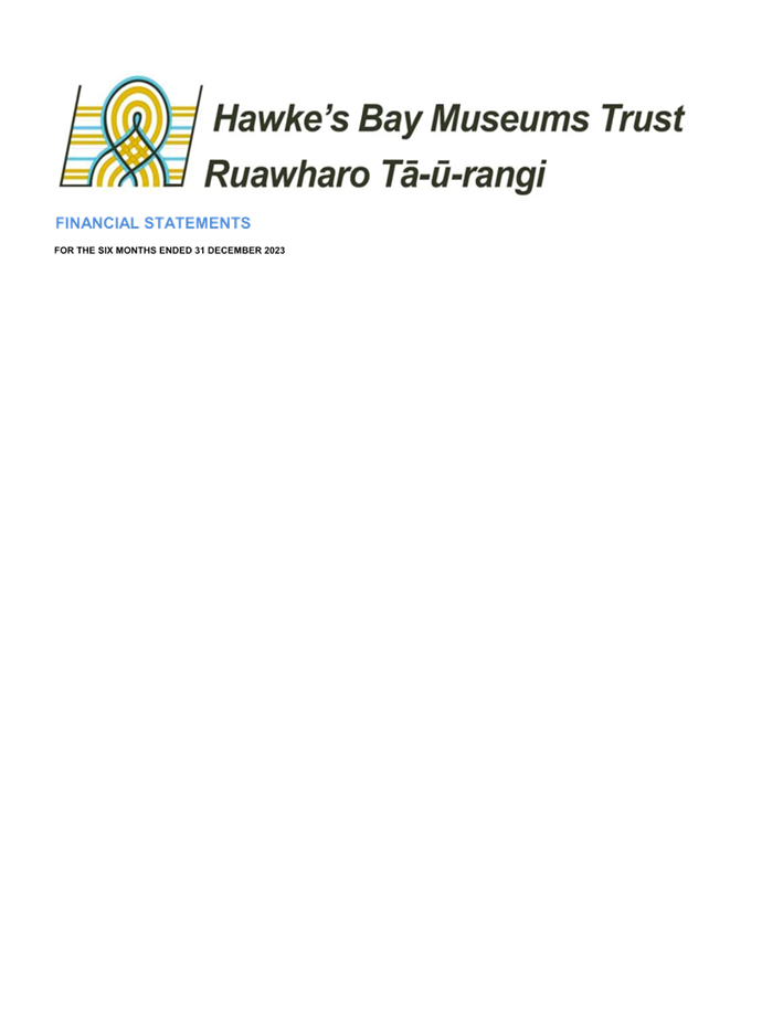 At the meeting of the Hawke’s Bay Museums Trust held on 1 March 2024, the Trustees adopted their Financial Report for the six months ended 31 December 2023. A copy is attached to this report for Council’s information.