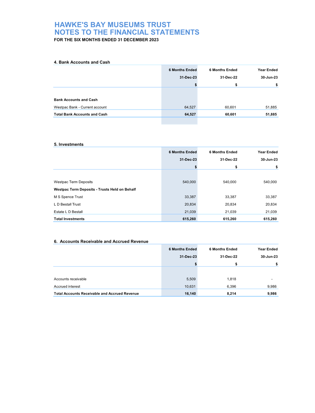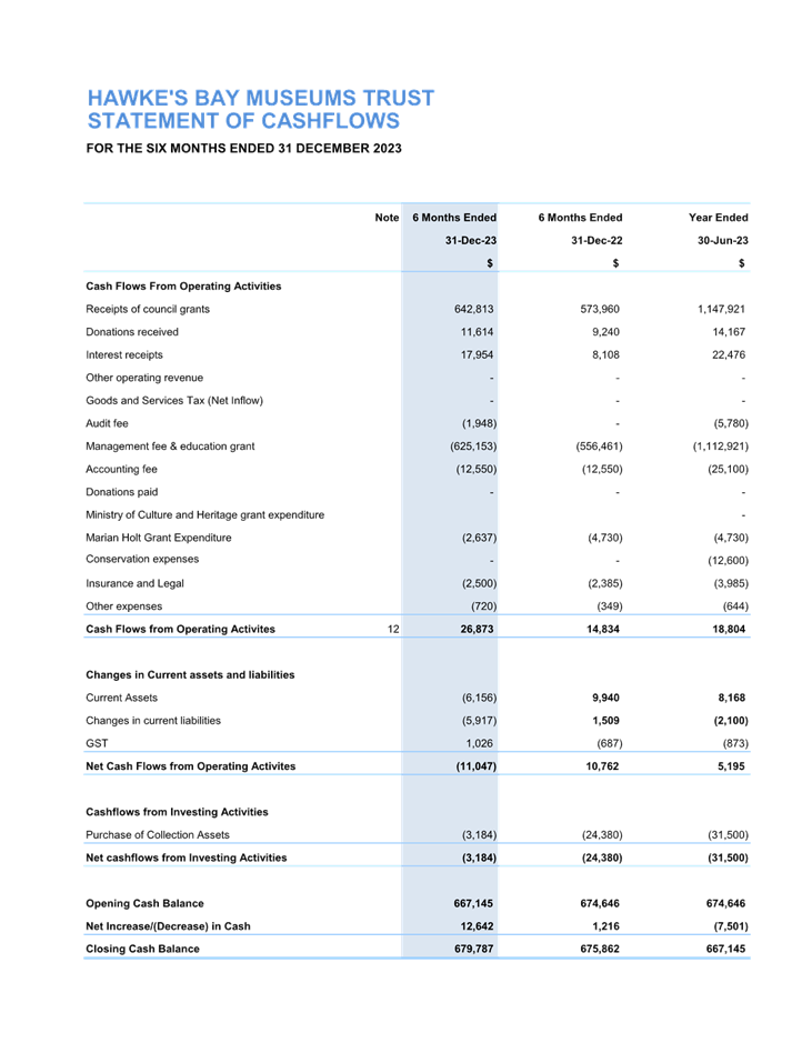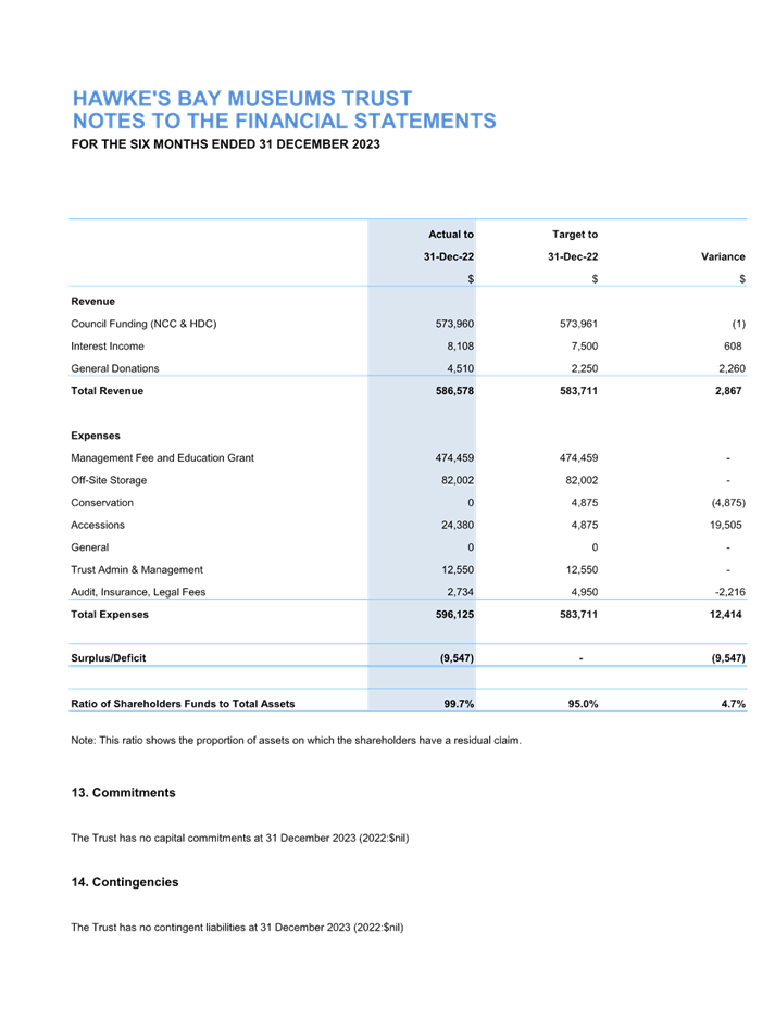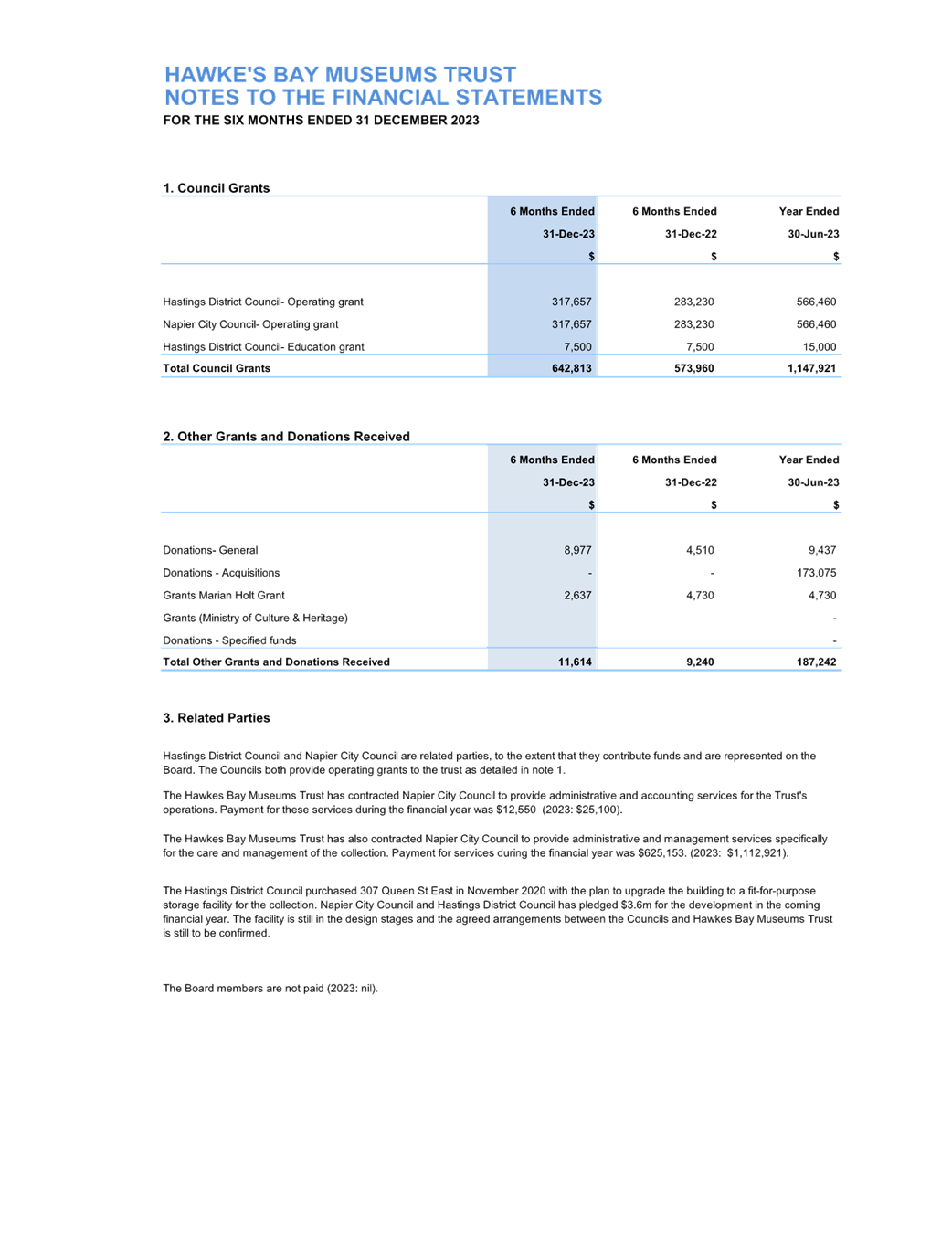 At the meeting of the Hawke’s Bay Museums Trust held on 1 March 2024, the Trustees adopted their Financial Report for the six months ended 31 December 2023. A copy is attached to this report for Council’s information.