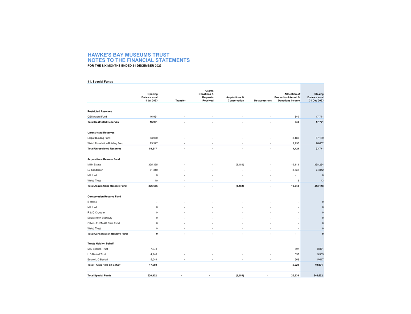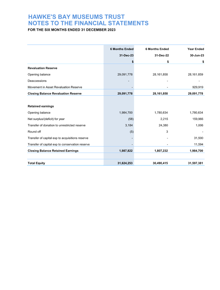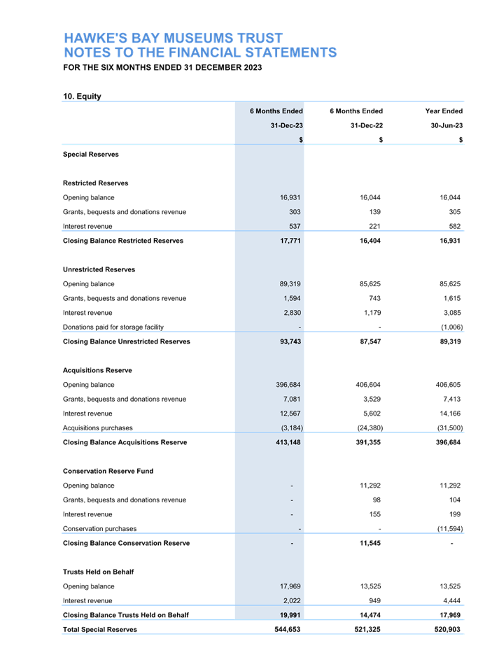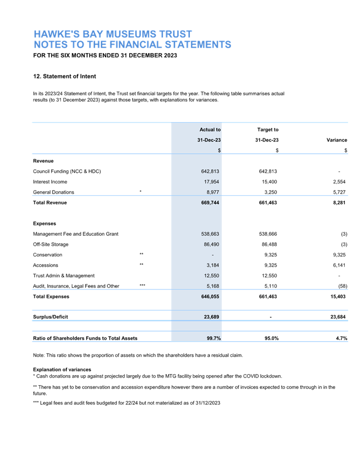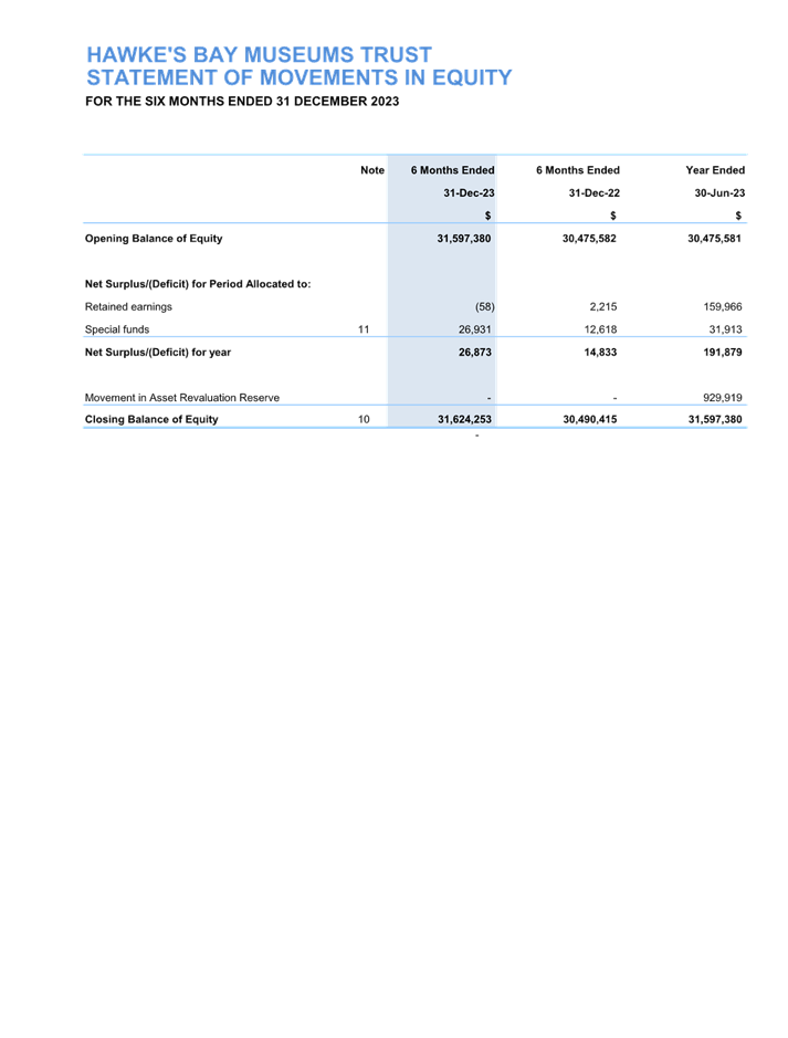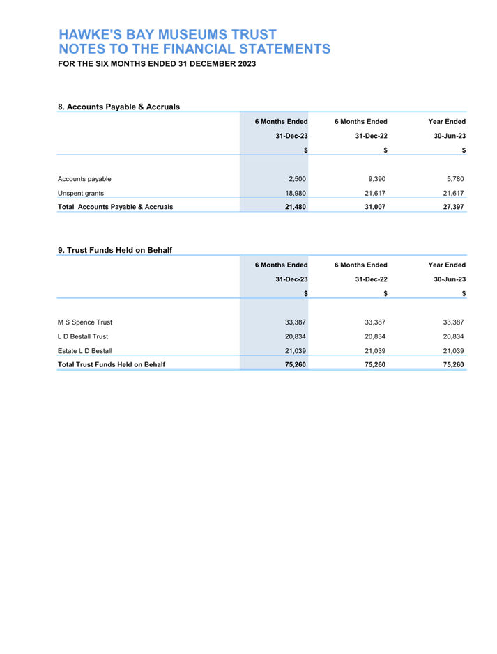At the meeting of the Hawke’s Bay Museums Trust held on 1 March 2024, the Trustees adopted their Financial Report for the six months ended 31 December 2023. A copy is attached to this report for Council’s information.