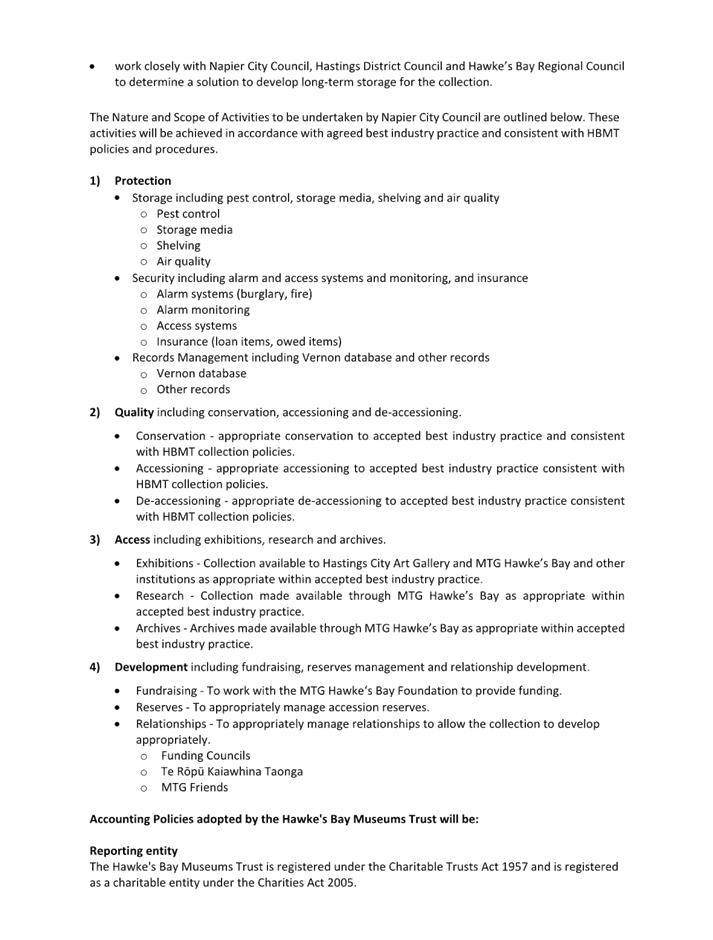 The Napier City Council continues to participate in a Joint Working Group with Hastings District Council that is considering the future structure of the Hawke’s Bay Museums Trust, its funding, the storage of the collection, and the role of the MTG Hawke’s Bay in the display of the collection.