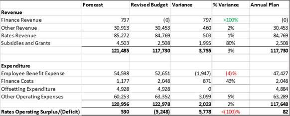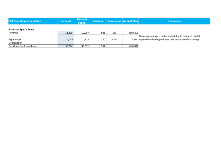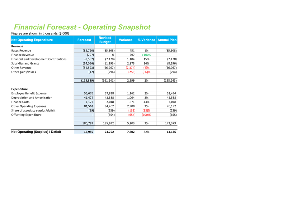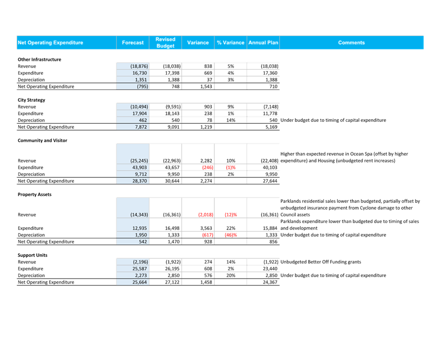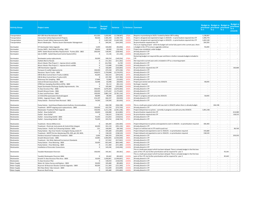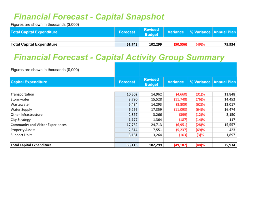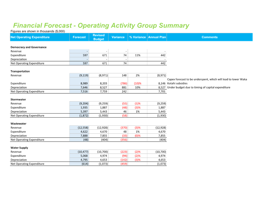 The attachment includes a summary schedule showing forecast operating and capital expenditure by activity group against the revised budget and compared to Annual Plan. The attachment also includes detail at a project level where the forecast expenditure varies from the revised budget.