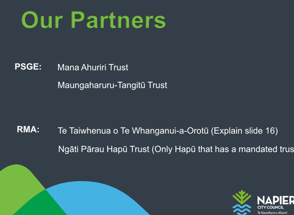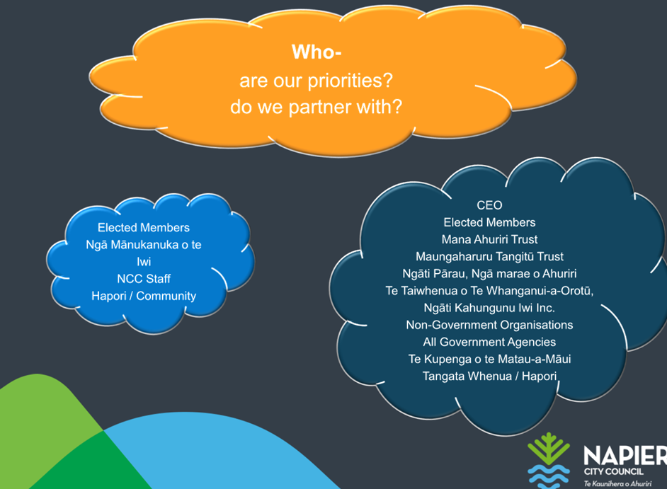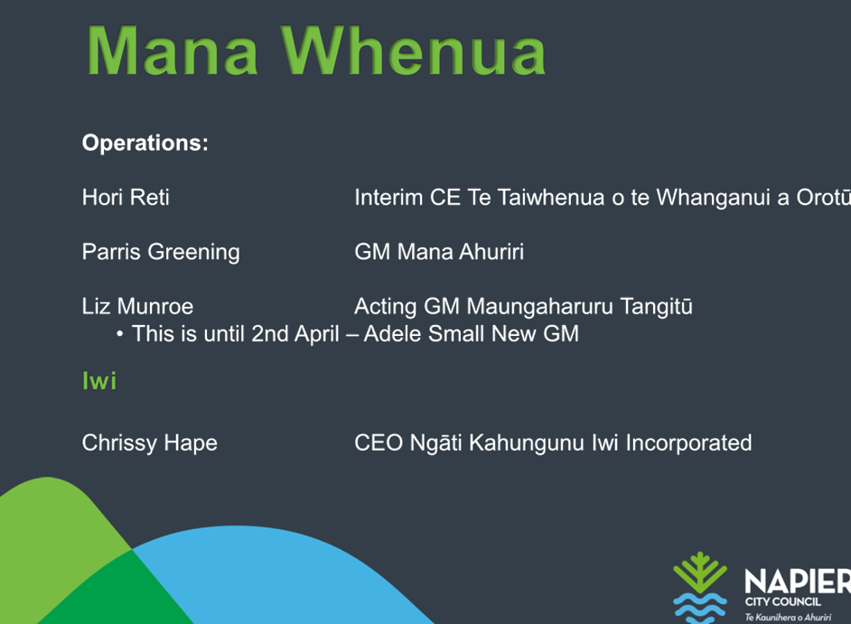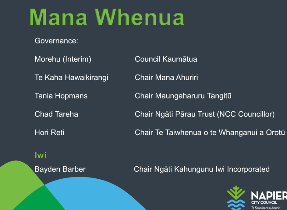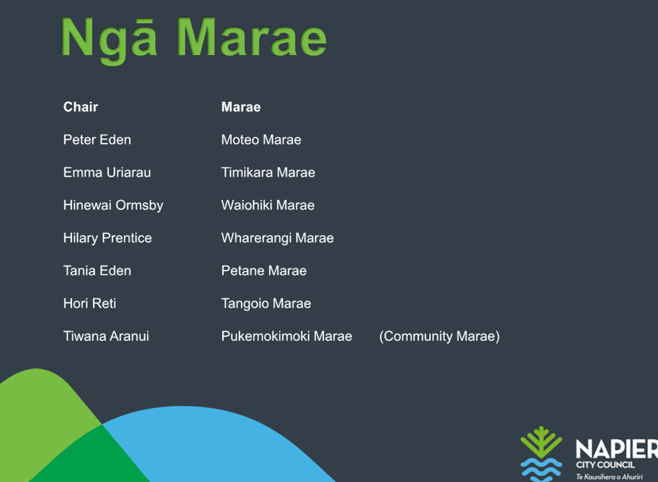 Mayor of Napier Chair off Future Napier Committee Chair of Sustainable Napier Committee Chair of Napier People & Places Committee Chair of Prosperous Napier Committee Petane Marae Representative Waiohiki Marae Representative Moteo Marae Representative Timikara Marae Representative Tangoio Marae Representative Wharerangi Marae Representative Pukemokimoki Marae Representative Mana Ahuriri Trust Representative Maungaharuru-Tangitū Trust Representative |