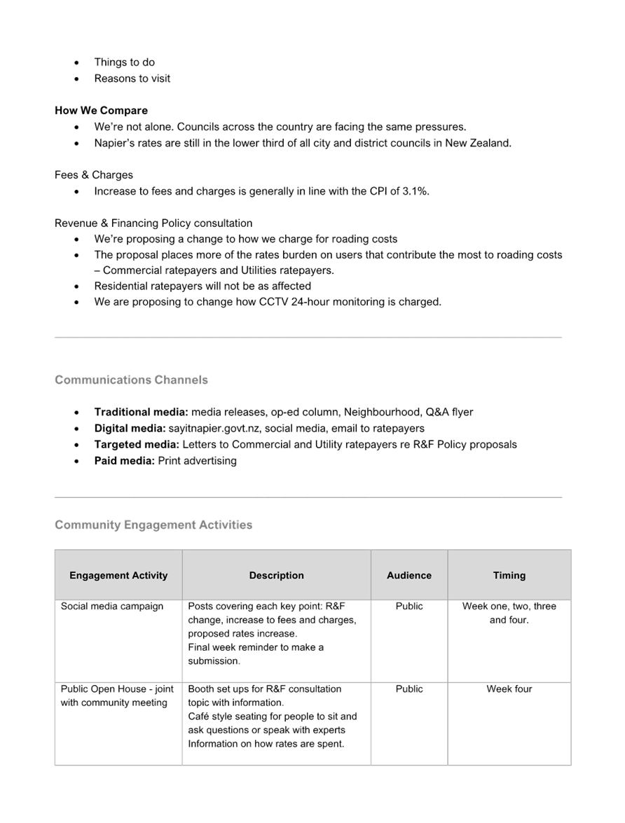 LTP/ Annual Plan/ Financial Strategy/ Infrastructure Strategy - Te Pae Tawhiti/ ā-tau / ā- Taunaki Ahumoni /ā- Taunaki Hanganga Strategic Alignment The Strategy was developed in response to formal and informal Council submissions and has been developed in partnership with the Napier community. The Strategy aligns with Council’s current Vision and Strategic Priorities, which guide decision making and inform annual and long-term planning. This includes, ensuring spaces and places for all, nurturing authentic relationships with our community partners, and a resilient city capable of thriving and withstanding impacts, knocks and shocks.